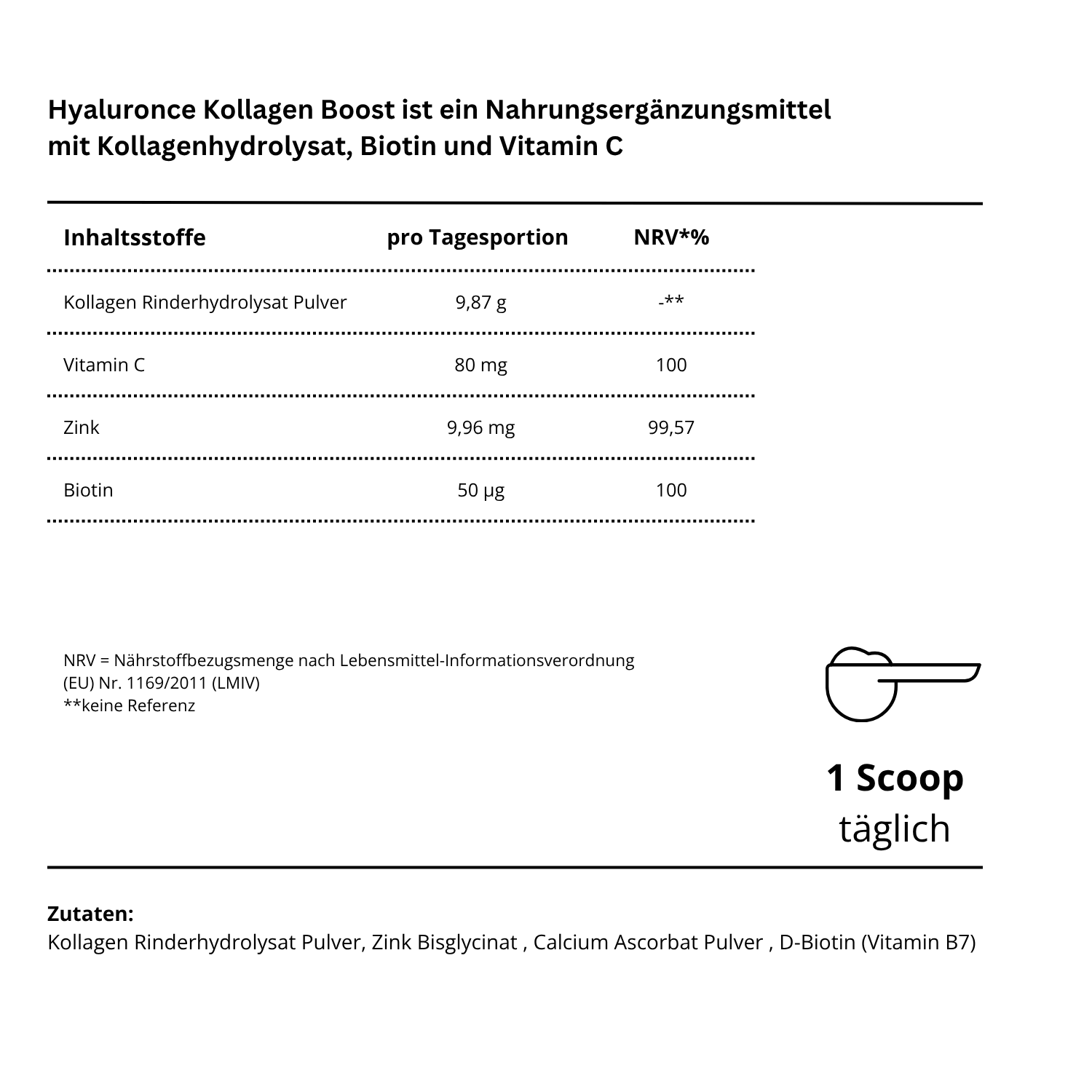 Kollagen Rinderhydrolysat Pulver, Zink Bisglycinat, Calcium Ascorbat Pulver, D-Biotin (Vitamin B7)