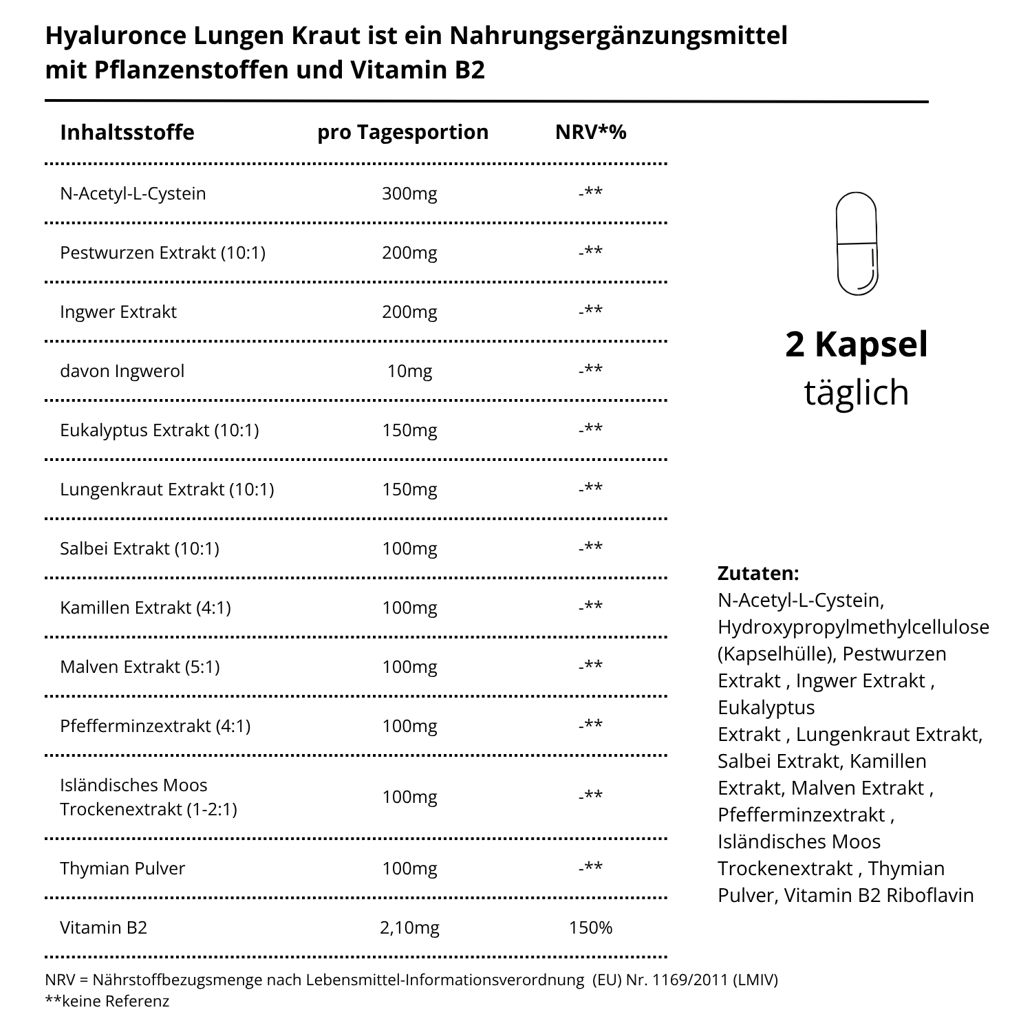 Die angegebene empfohlene tägliche Verzehrmenge darf nicht überschritten werden. Nahrungsergänzungsmittel sind kein Ersatz für eine ausgewogene und abwechslungsreiche Ernährung und gesunde Lebensweise.