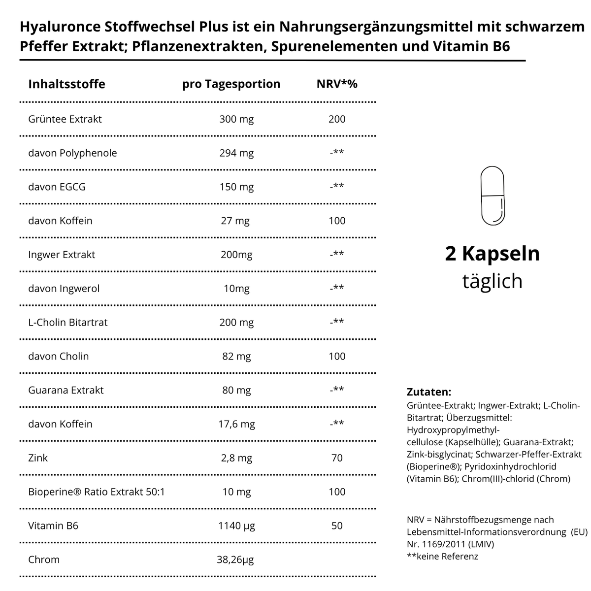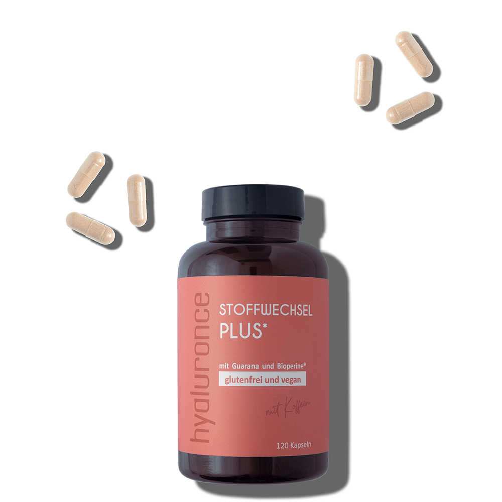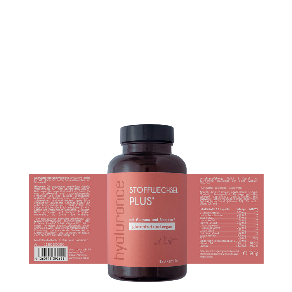hyaluronce Stoffwechsel Plus kombiniert Chrom, Vitamin B6 und Zink mit ausgewählten Pflanzenextrakten wie Grüntee, Guarana, Ingwer und schwarzem Pfeffer. Chrom trägt zu einem normalen Stoffwechsel von Kohlenhydraten, Fetten und Eiweiß bei und hilft, einen normalen Blutzuckerspiegel aufrechtzuerhalten. Vitamin B6 unterstützt den normalen Energiestoffwechsel und trägt zur Verringerung von Müdigkeit und Ermüdung bei.