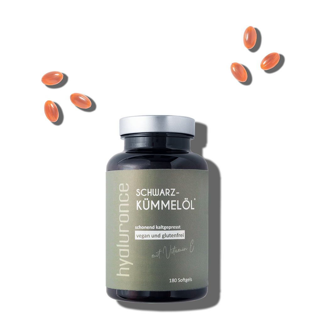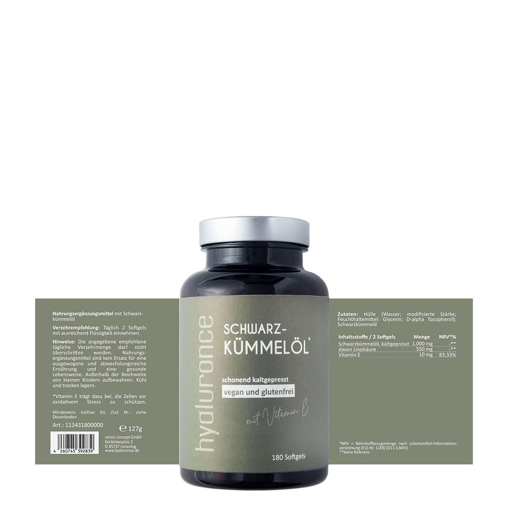 hyaluronce Schwarzkümmelöl enthält hochwertiges Öl mit einem natürlichen Gehalt an Linolsäure, einer essentiellen Omega-6-Fettsäure. Linolsäure gehört zu den Fettsäuren, die der Körper nicht selbst herstellen kann und die regelmäßig über die Ernährung aufgenommen werden müssen.
