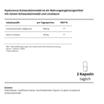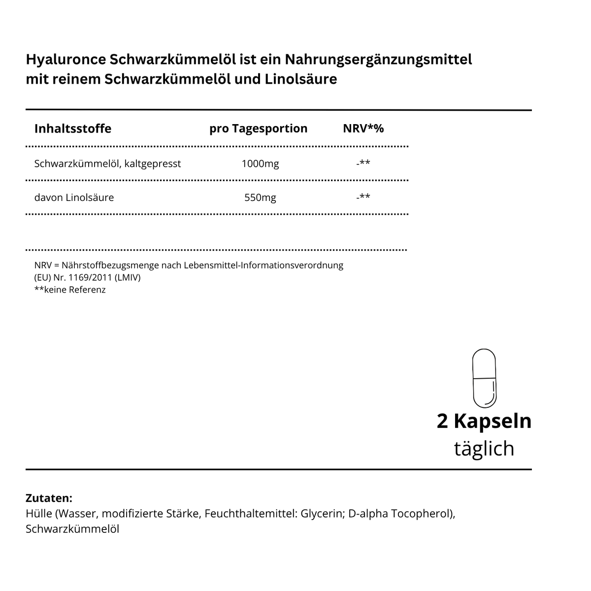 Hülle (Wasser, modifizierte Stärke, Feuchthaltemittel: Glycerin; D-alpha Tocopherol), Schwarzkümmelöl