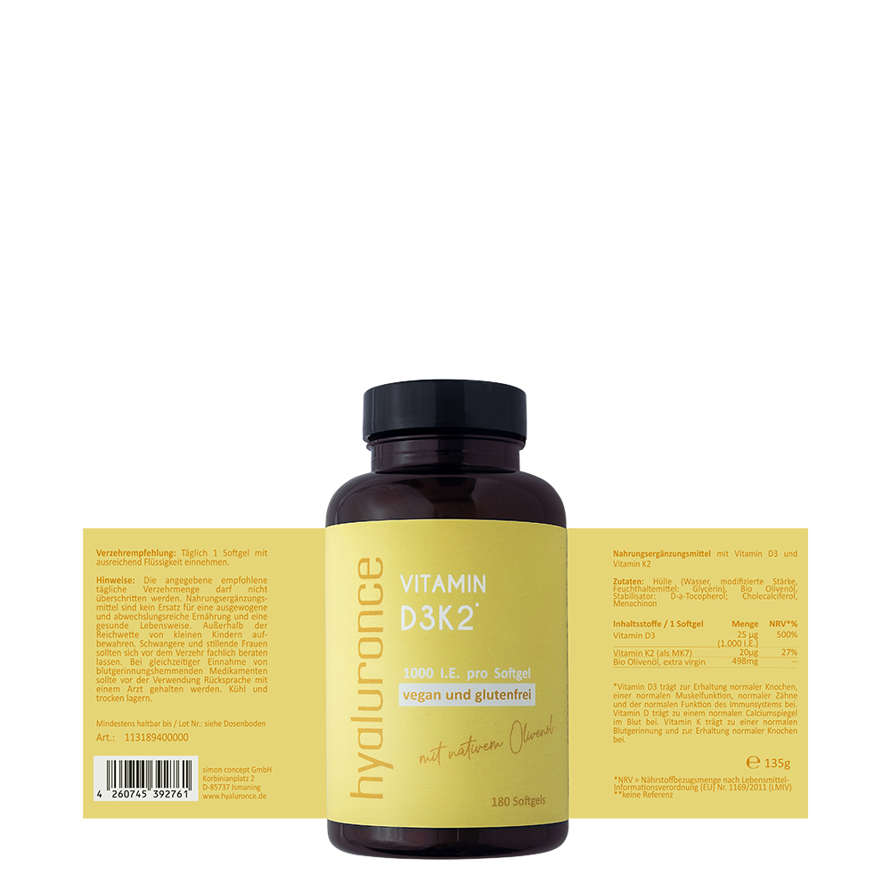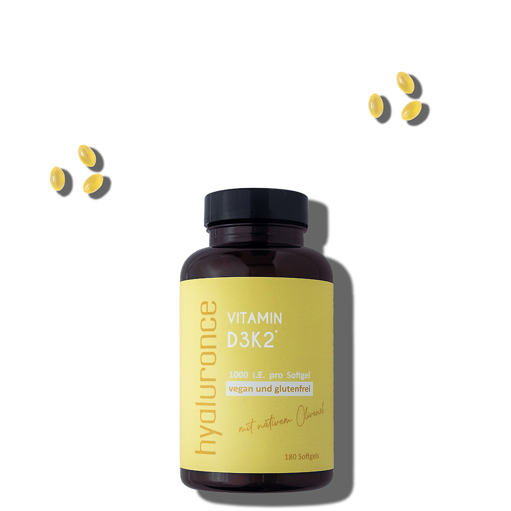 Vitamin D3 - trägt zur normalen Funktion des Immunsystems bei - ist wichtig für die Erhaltung normaler Knochen - trägt zur Aufrechterhaltung einer normalen Muskelfunktion bei - unterstützt die normale Aufnahme von Calcium und Phosphor - trägt dazu bei, den normalen Blutcalciumspiegel aufrechtzuerhalten - Spielt eine Rolle bei der Zellteilung Vitamin K2 - trägt zur Erhaltung normaler Knochen bei - trägt zu einer normalen Blutgerinnung bei