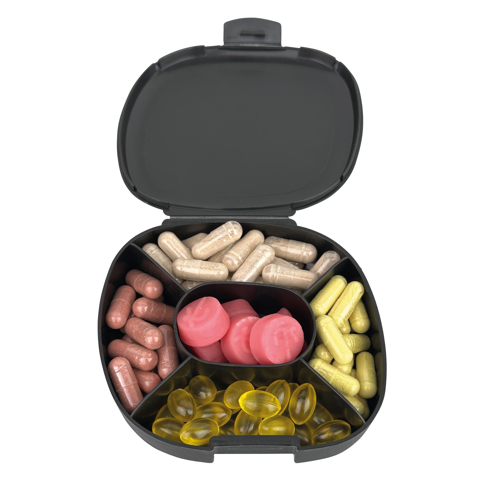 Fünf praktische Fächer bieten Platz für Deine liebsten Supplements – von Collagen-Kapseln über Vitamine bis hin zu Mineralstoffen.