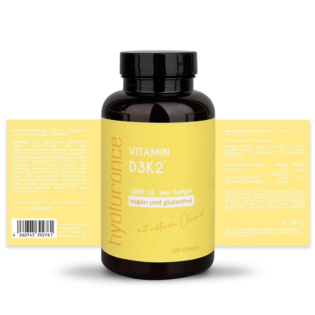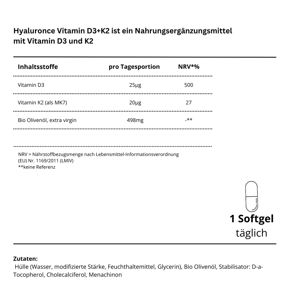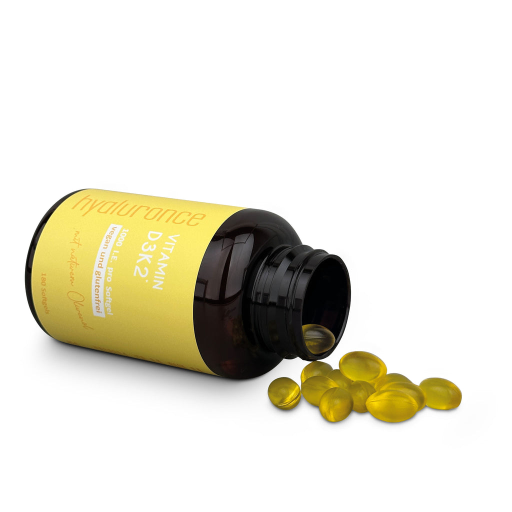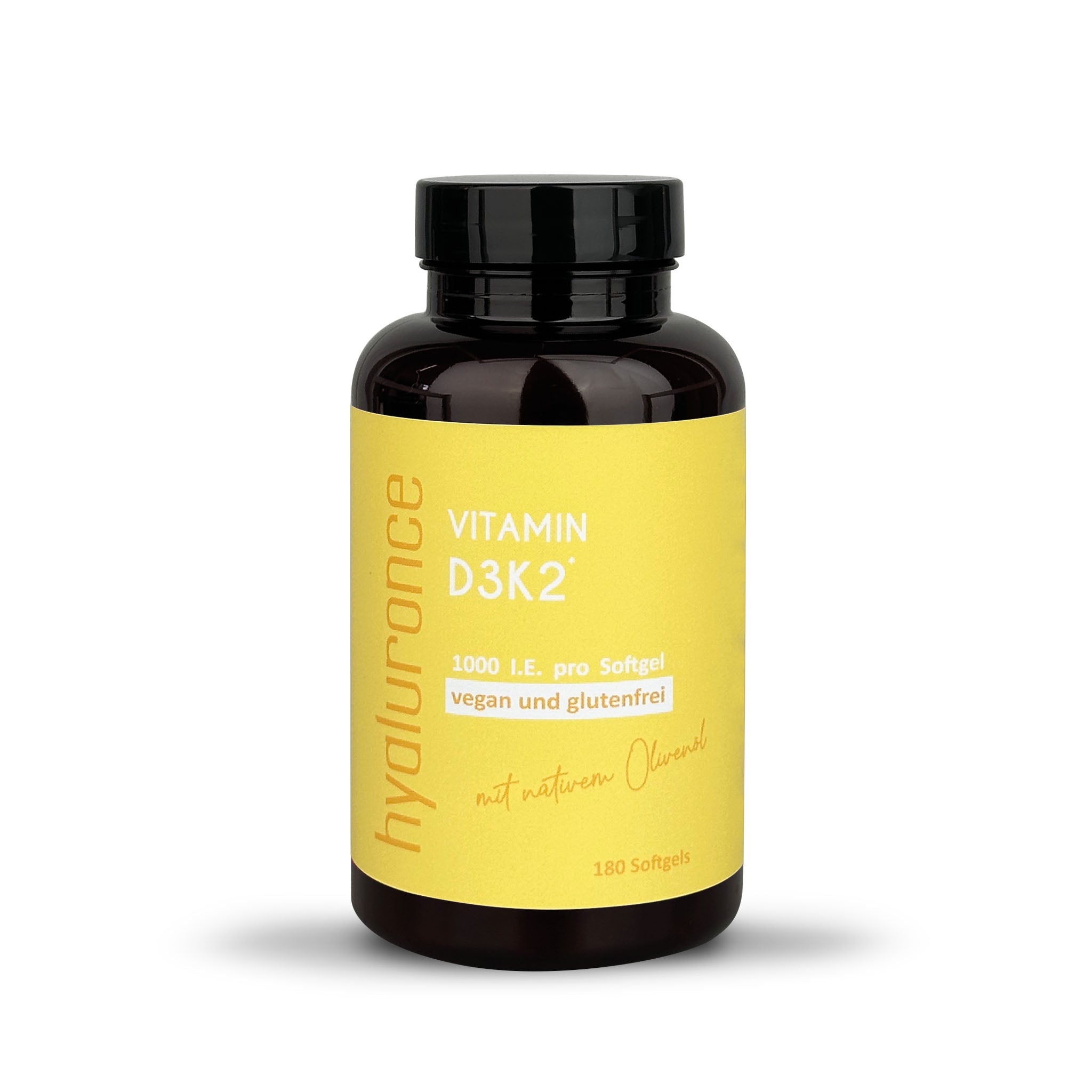 Vitamin D3 - trägt zur normalen Funktion des Immunsystems bei - ist wichtig für die Erhaltung normaler Knochen - trägt zur Aufrechterhaltung einer normalen Muskelfunktion bei - unterstützt die normale Aufnahme von Calcium und Phosphor - trägt dazu bei, den normalen Blutcalciumspiegel aufrechtzuerhalten - Spielt eine Rolle bei der Zellteilung Vitamin K2 - trägt zur Erhaltung normaler Knochen bei - trägt zu einer normalen Blutgerinnung bei